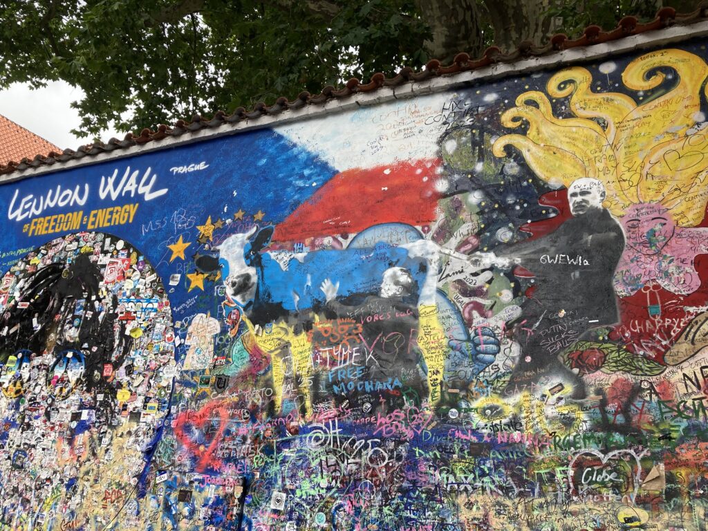 A manifestation of popular support for Ukraine was also visible on the famous graffiti-covered John Lennon Wall in Prague. Established as a site of homage after the famous Beatle’s murder in 1980, it morphed into an ever-evolving display of anti-authoritarian protest messages. Today it serves as a canvas for free expression and commentary on contemporary issues. There was a drawing that particularly caught our attention – an anonymous street artist had painted an image of President Trump milking a blue and yellow cow, apparently a reference to the at-first contentious and lopsided effort of the U.S. administration to coerce Ukraine into signing a minerals deal. I added my own message to the wall: Freedom and Peace and Justice for Ukraine!